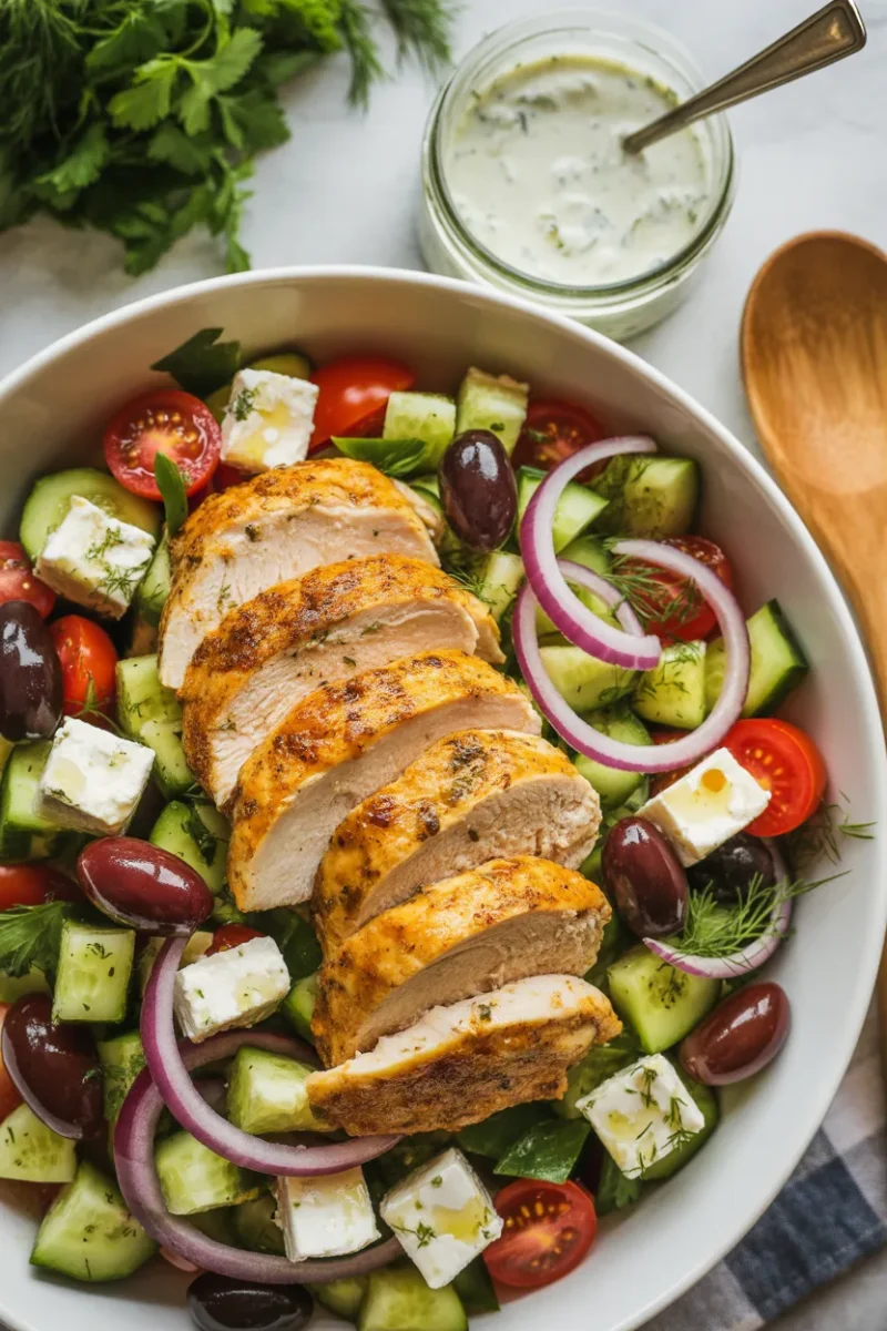 A fresh and vibrant Greek Chicken Salad with Feta combining tender marinated chicken, crisp vegetables, Kalamata olives, and creamy feta cheese with a tangy Greek yogurt dressing. A healthy Mediterranean meal ready in under an hour.