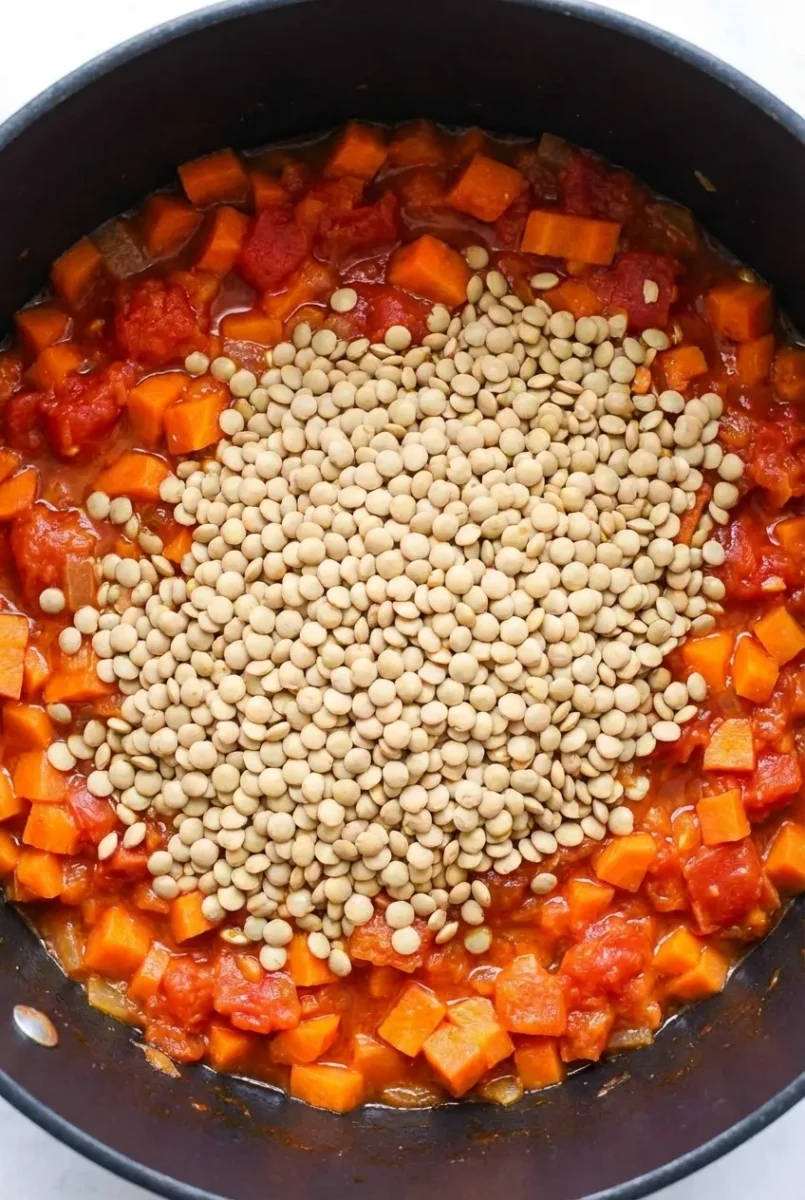 Pour in the crushed tomatoes, lentils, and vegetable stock. Bring everything to a boil.
