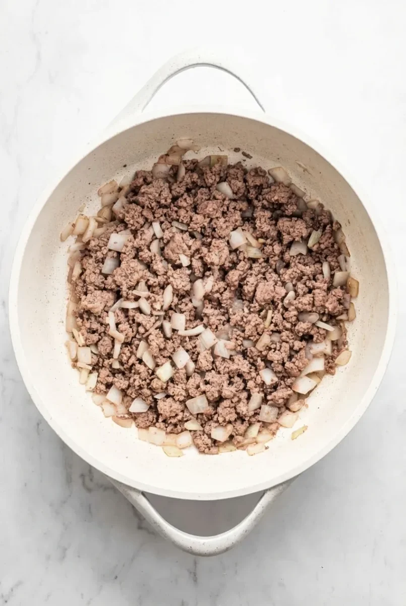 - Add ground beef, season with salt and pepper, and brown completely. Drain excess grease if needed.