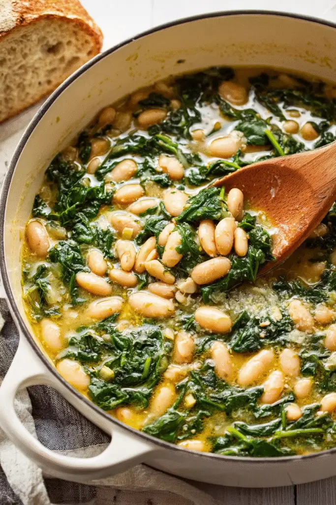 Simmer uncovered for 10–12 minutes, allowing the flavors to blend. The beans should be tender, the greens soft but not mushy.